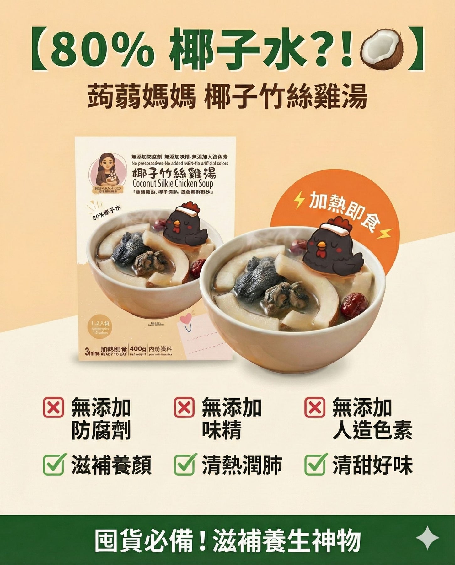 🥣 蒟蒻媽媽椰子竹絲雞湯:80%椰子水燉煮,真材實料,有雞肉+椰子片,鮮甜滋補,零添加零防腐劑!
