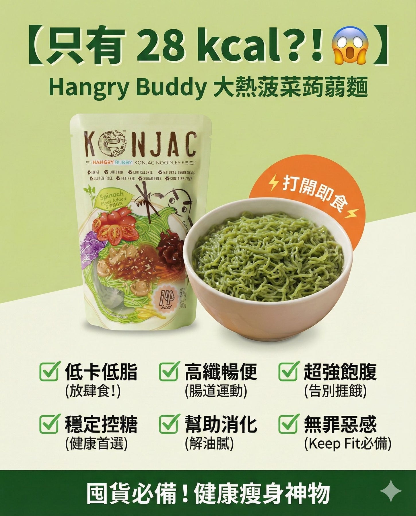 🍜 Hangry Buddy 菠菜蒟蒻麵:一包只係28卡!高纖超飽肚,直接加入熱湯,掛湯力滿分,味道即刻升級😋